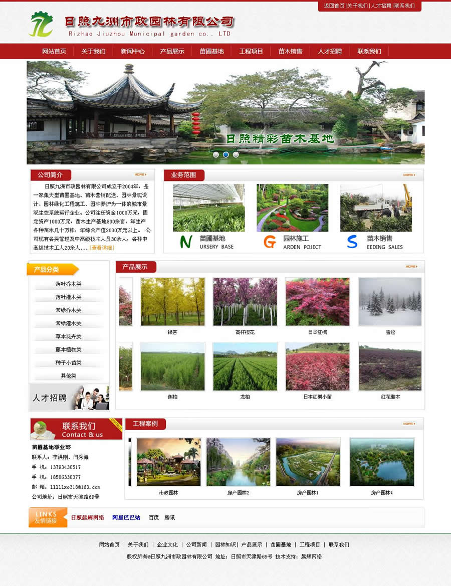 日照九洲市政园林有限公司成立于2004年,是一家集大型苗圃基地、苗木营销配送、园林景观设计、园林绿化工程施工、园林养护为一体的城市景观生态系统运行企业。公司注册资金1000万元,固定资产1000万元,苗木生产基地800余亩,年生产各种苗木几十万株,年综合产值2000万元以上。 公司现有各类管理及中高级技术人员30余人,各种中高级技术工人20余人,培育、设计、施工、养护力量强大,技术精湛,能承接各种园林规划、景观设计、工程施工及苗木订单等一系列工作,业务遍及全省各地。